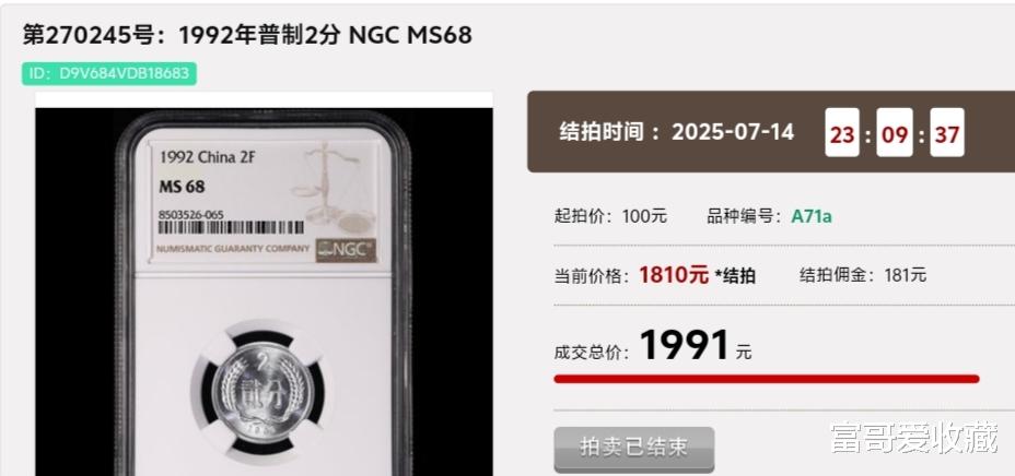 在2025年7月14日的“钱币拍卖会”中,一枚NGC评级(MS68分)的1992年“普制2分”硬币,最后拍出了1991元。