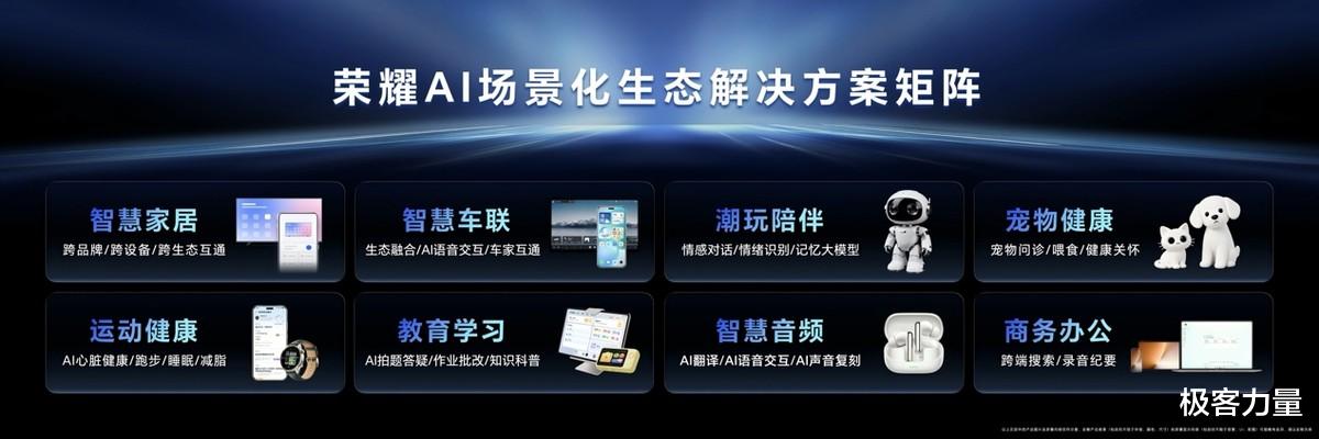 为解决用户面对“场景割裂、服务单一”的智能生态时带来的碎片化体验,并攻克行业长期存在的互联互通难题,荣耀基于HONOR AI Connect平台,发布了8大AI场景化生态解决方案,覆盖智慧家居、智慧车联、潮玩陪伴、宠物健康、运动健康、教育学习、智慧音频、商务办公等场景。此次发布的8大AI场景化生态解决方案深度融合软硬件能力,是荣耀构建AI生态的核心引擎。荣耀将把这些解决方案全面向行业开放,携手合作伙伴共同推进更多AI垂直领域的生态共创,打造一个繁荣、开放、持续进化的AI终端生态,全面构建以人为中心的智能生活闭环。
