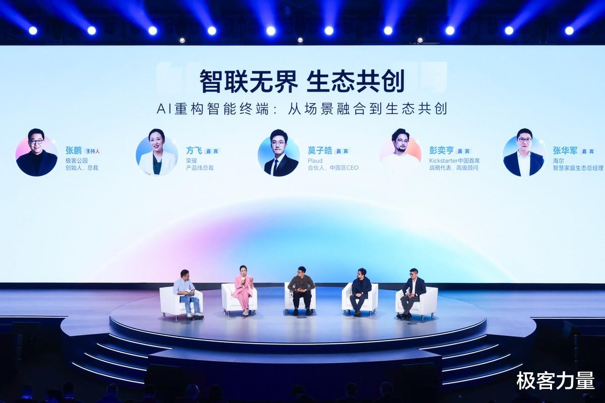 在大会主论坛,紧随AI生态战略与“HONOR AI Connect”平台发布之后,一场以 “AI重构智能终端:从场景融合到生态共创” 为主题的圆桌讨论亦如期举行。荣耀产品线总裁方飞、海尔智慧家庭负责人张华军、AI新锐公司Plaud合伙人、中国区CEO莫子皓以及全球众筹平台Kickstarter的彭奕亨,在极客公园创始人张鹏的主持下,从终端、家居、AI硬件及全球视角,共同探讨AI终端生态的未来发展路径。