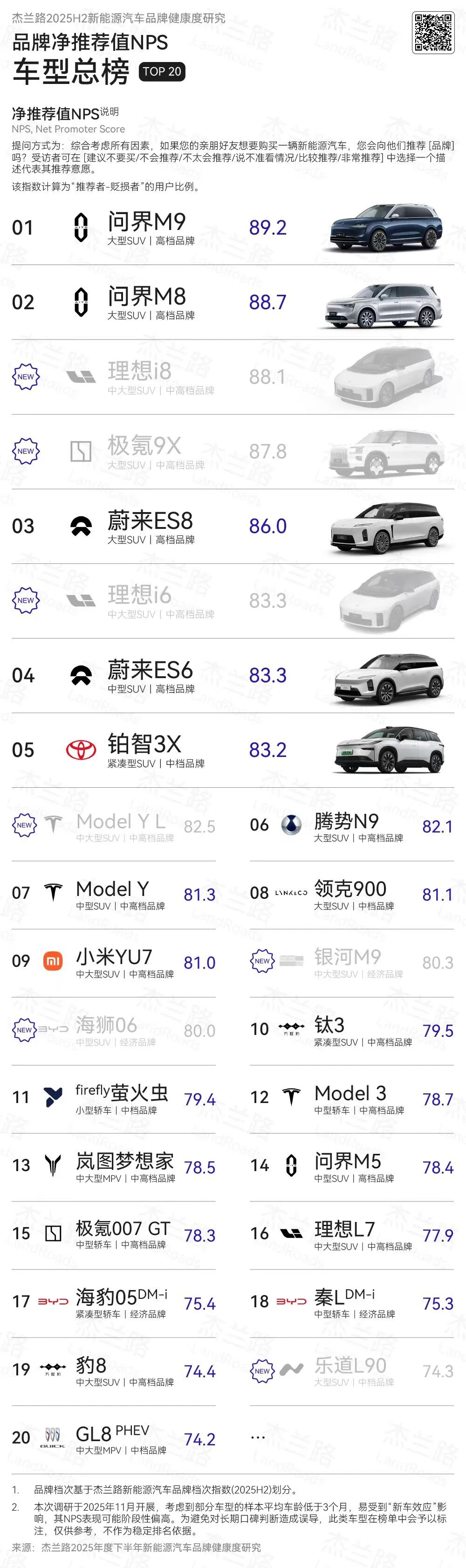 在新能源汽车行业,净推荐值(NPS)是衡量用户真实满意度与品牌忠诚度的硬核指标,得分超过80即代表用户口碑进入行业顶尖水平。杰兰路报告显示,问界品牌NPS达到82.5,不仅是行业第一,更是本期唯二突破80的品牌之一,这标志着问界在用户心智中已建立起超越单纯产品层面的情感联结与口碑信任。