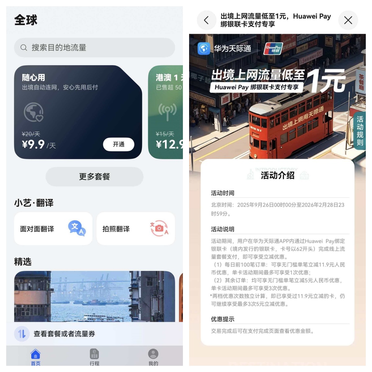 除了0元领流量外,华为天际通还与银联合作推出流量特惠活动,绑定中国大陆发行的 62 开头银联卡,购买天际通流量使用Huawei Pay 支付即可享受立减优惠,活动期间最多可享受3次优惠。