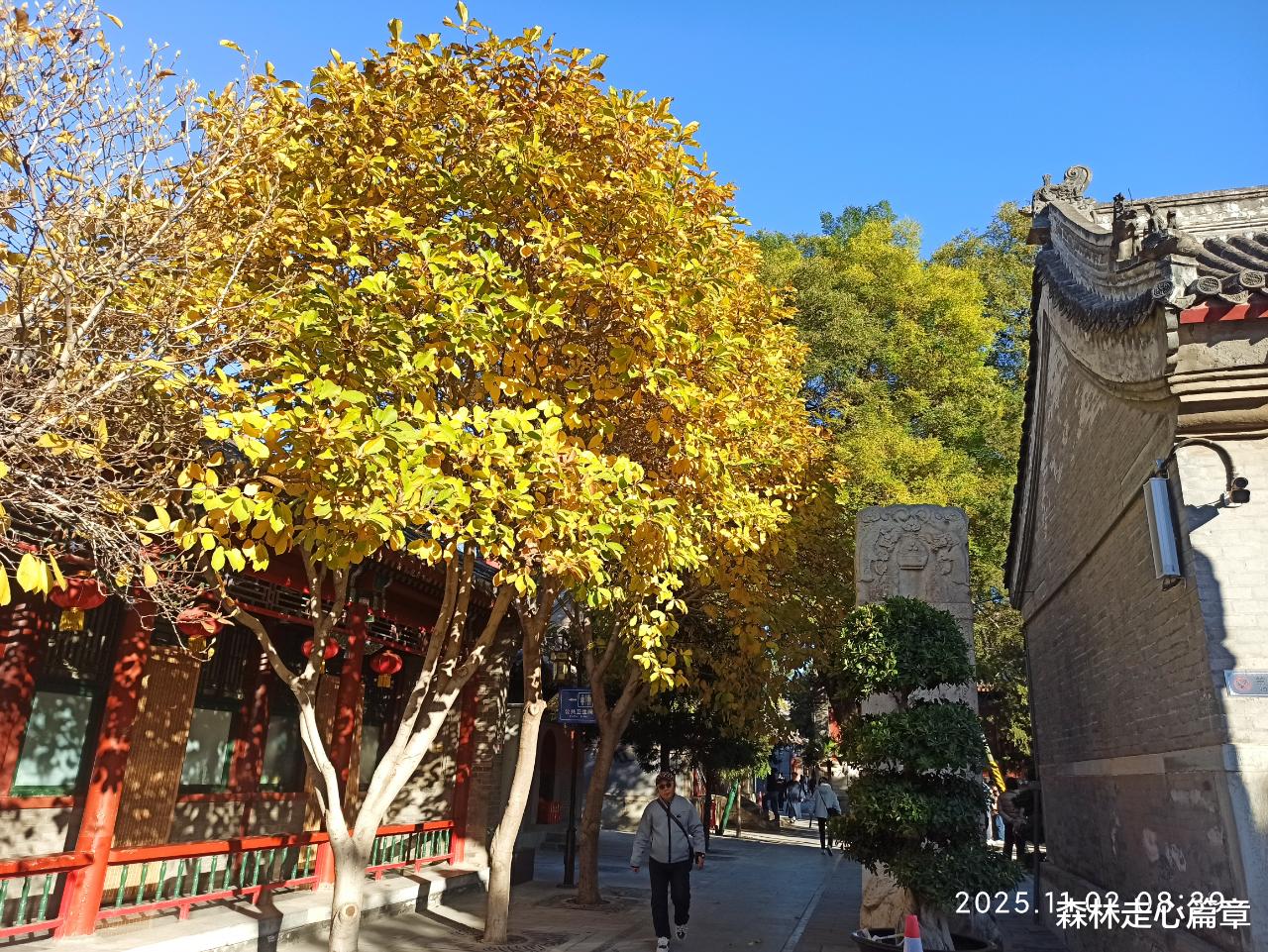 走进道观,首先映入眼帘的是那几棵高大的银杏树。此时正值深秋,银杏树的叶子已经变成了金黄色,宛如一把把金色的小扇子,在微风中轻轻摇曳。满树的金黄与道观的红墙相互映衬,构成了一幅绝美的画卷。阳光透过树叶的缝隙洒下,形成一道道金色的光柱,仿佛是神仙洒下的祥瑞之光。树下,有许多人驻足观赏,他们或拍照留念,或静静地欣赏着这秋日的美景,脸上洋溢着陶醉的神情。
