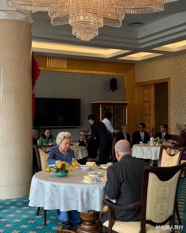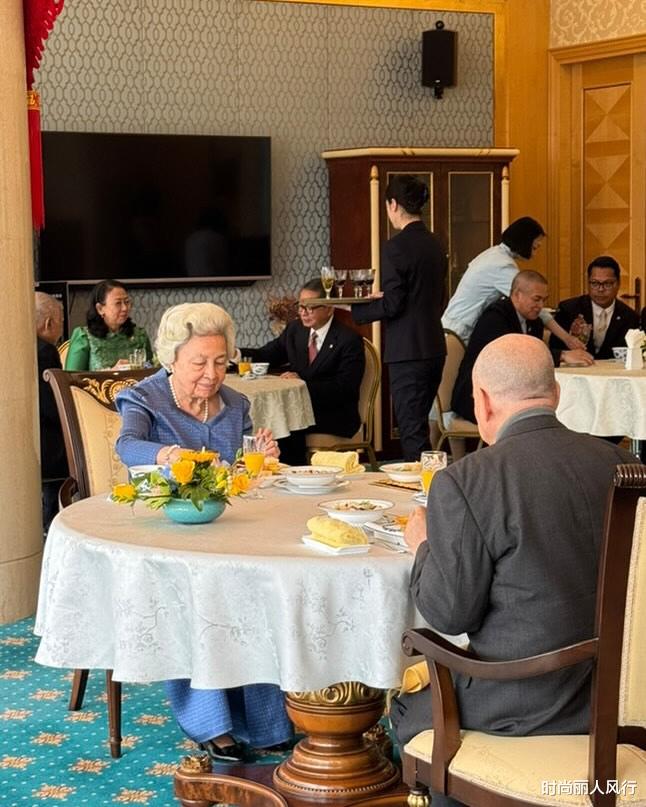 非常养生的饮食搭配,新鲜的果汁放在桌上,柬埔寨太后和国王吃的一样。而其他桌也是有客人,从邻桌那位女士的穿搭来看,应该也是柬埔寨的。