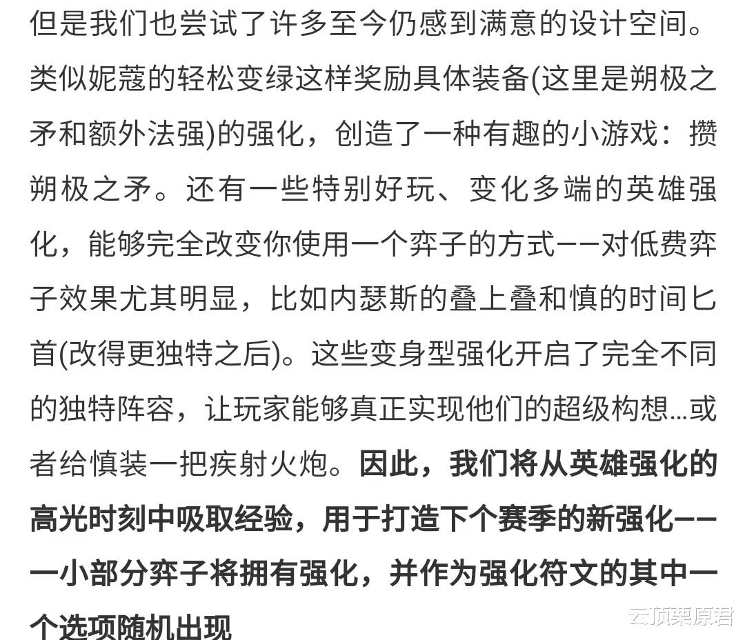 最后就是玩法问题,下个赛季高羁绊可能会成为主流阵容,毕竟设计师已经准备削弱纹章之书了,类似于这个赛季的小天才,源计划。