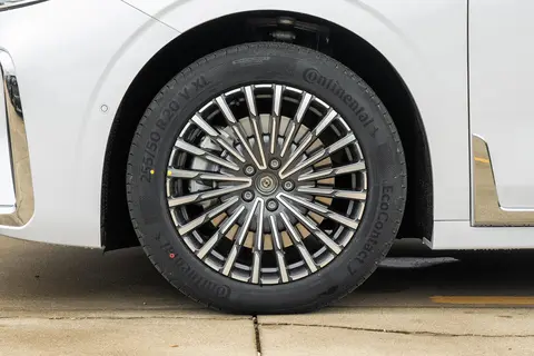 空气悬架系统具备上下调节功能,迎宾模式下车身会自动降低30毫米,门槛离地高度仅为360毫米,老人、小孩上下车无需费力抬腿。同时,悬架可根据路况智能调整阻尼,过减速带时滤震柔和,高速巡航时又能提供足够的支撑力,兼顾舒适性与稳定性。