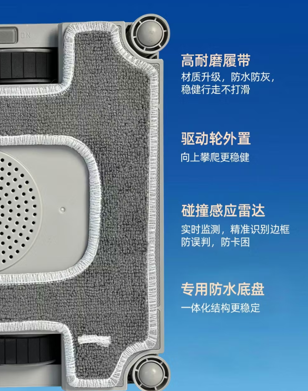 第三、智能擦窗机器人哪个牌子好?关注边框清洁设计,选机身侧边带贴边清扫胶条、高度在8-10cm左右的机型,能紧密贴合窗框边缘,轻松清理密封条处的积垢,不用再手动补擦。