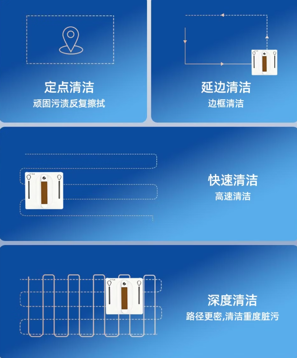 采用锁水无痕技术的高密度纤维抹布,擦拭更干净,仿人手75N强力去污,四维边框智能感应,紧密贴合擦拭,拥有四大清洁模式运用AI智感主控芯片,感知周围环境,自动避障清洁,自动规划路径,语音智能播报,实时获取信息,全程语音反馈,从启动到收工配备一键换布,一键收线功能。不过它的智能避障能力较弱,遇到窗框等障碍物时容易卡顿,路径规划的灵活性有待提高,在复杂窗格环境下,可能会出现重复清洁或漏擦的情况,
