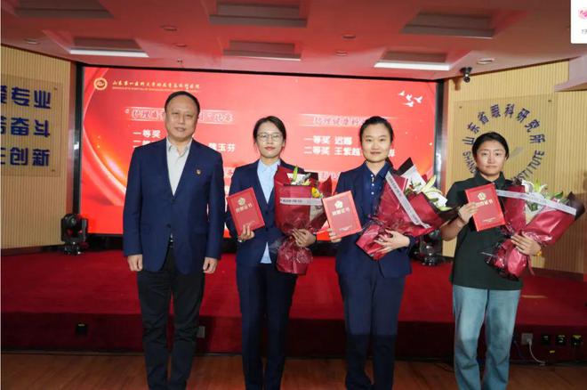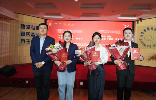 党委书记乔镇涛为护理健康科普比赛一等奖获奖者迟娜、二等奖获奖者王紫越、臧金锋颁奖。
