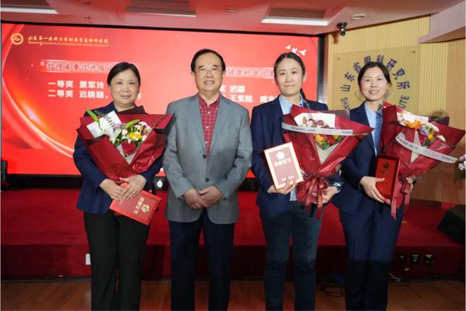谢院士为“护理质量改进项目”比赛一等奖获奖者景军玲、二等奖获奖者迟晓晓、魏玉芬颁奖。