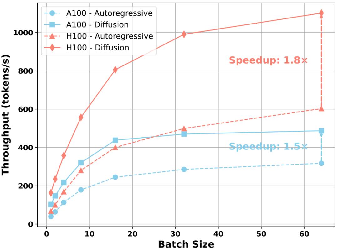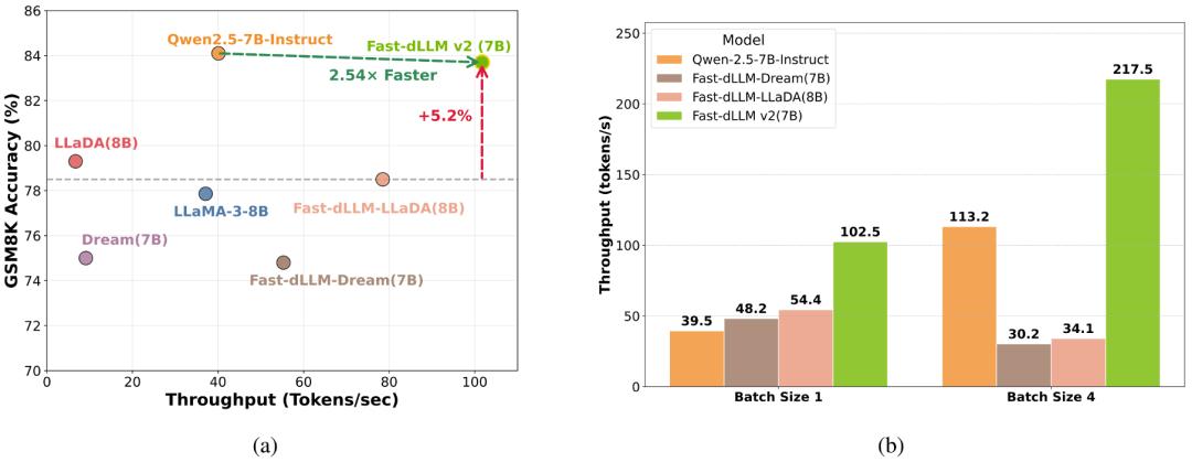 端到端加速:综合实验显示,对标准 AR 解码最高 2.5× 提速,同时维持生成质量。 7B 规模吞吐与精度:在 A100 上,Fast-dLLM v2(7B)吞吐为 Qwen2.5-7B-Instruct 的 2.54×;同时对比 Fast-dLLM-LLaDA 还有 +5.2% 的准确率提升(GSM8K)。 Batch / 硬件可扩展性:在 A100/H100 上随 batch 增大,扩散解码的并行优势更明显;A100 上可达~1.5× 吞吐加速,H100 上最高可达~1.8× 加速。