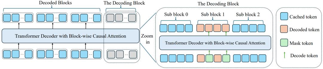 块级缓存:已解码块的 KV 直接复用,天然支持 KV Cache。 子块缓存(DualCache):在部分解码的当前块内部,同时缓存前缀与后缀的 KV 激活,减少迭代去噪揭示 / 复原时的重复计算,贴合并行细化流程。