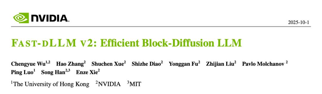 作者单位:HKU、NVIDIA、MIT。 论文链接:https://arxiv.org/pdf/2509.26328 项目网站链接:https://nvlabs.github.io/Fast-dLLM/v2/ 代码链接:https://github.com/NVlabs/Fast-dLLM