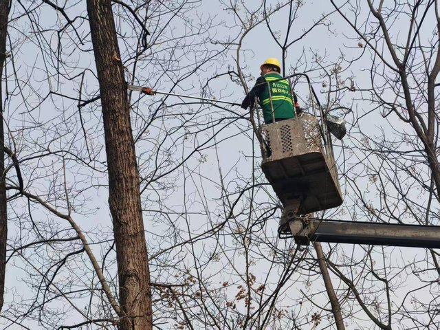 行动中,工作人员秉持“安全第一、科学修剪”原则,借助高空作业车、油锯等专业设备,对园区步道两侧、亲水平台周边及人流密集区域的树木进行拉网式排查。重点清理枯萎枝、病虫枝、下垂枝,科学修剪过密枝条,既消除安全隐患,又优化树冠形态,兼顾生态防护与景观美观。