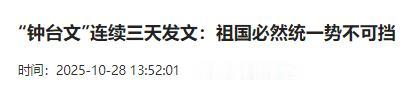 10月28日,新华社刊发“钟台文”署名文章《祖国必然统一势不可挡》。这也是26日以来“钟台文”第三篇关于台湾问题的文章。