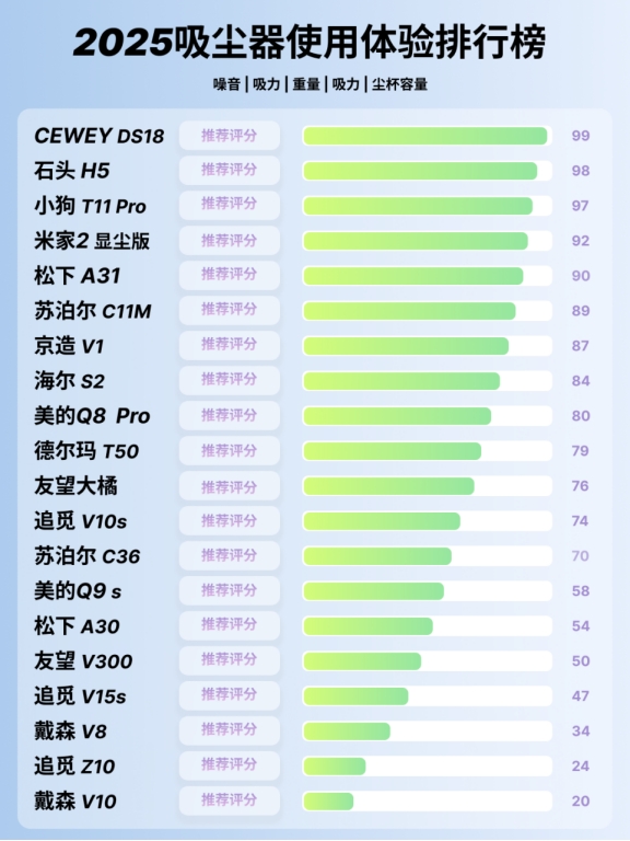 根据上面建议表格中的关键参数,接下来先放一张2025年热门吸尘器总体使用体验排行的天梯图,能跟快速地帮助大家对比选择出适合自己的吸尘器。