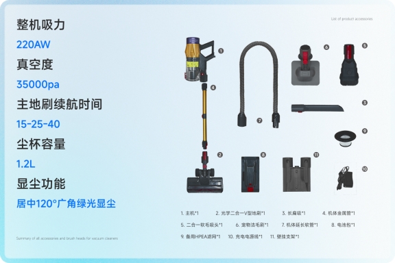 l 用户体验:120°广角绿光显尘矩阵,视觉辅助清洁能够精准照亮肉眼难以察觉的微尘。结合第六代轻量化人体工学优化机身,重量仅为1.5kg,在长时间手持操作时,依然能获得舒适的握持感,不易疲劳。配备了1.2L大容量尘杯,减少了清洁过程中的倒尘频率。同时,配备了多款刷头组合包括针对性的宠物吸毛刷等可以灵活组合,适应地板、地毯、缝隙、高处等全屋清洁场景。