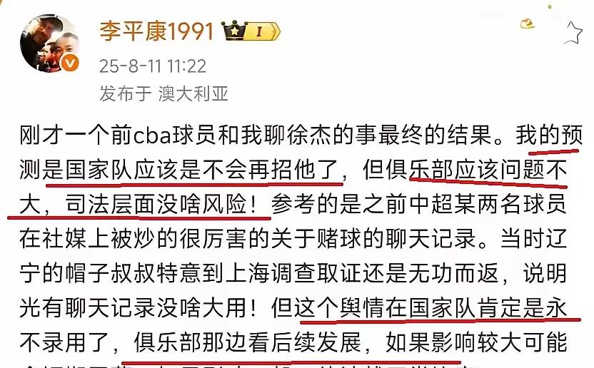 媒体人李平康表示:刚才一个前cba球员和我聊徐杰的事最终的结果。我的预测是国家队应该是不会再招他了,但俱乐部应该问题不大,司法层面没啥风险!参考的是之前中超某两名球员在社媒上被炒的很厉害的关于赌球的聊天记录。当时辽宁的帽子叔叔特意到上海调查取证还是无功而返,说明光有聊天记录没啥大用!但这个舆情在国家队肯定是永不录用了,俱乐部那边看后续发展,如果影响较大可能会短期雪藏,如果影响一般,估计就正常比赛!