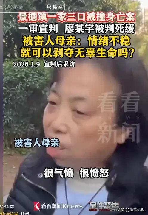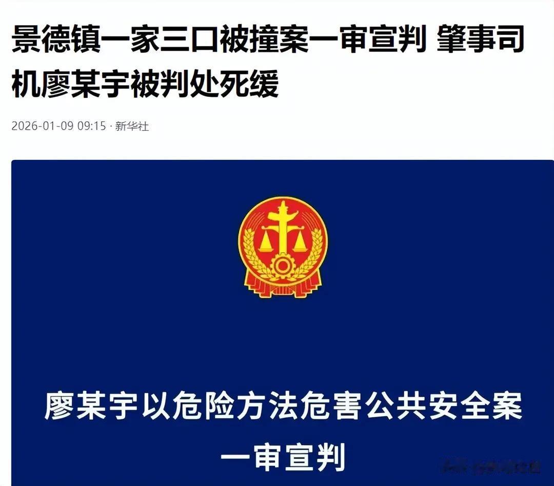 2026年1月9日上午,景德镇市中级人民法院的法槌落下,肇事司机廖某宇因以危险方法危害公共安全罪被判死刑缓期二年执行。