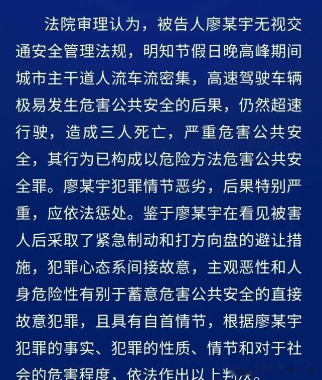 法院给出的死缓理由很明确:廖某宇撞人前0.4秒有紧急制动和避让动作,认定为主观“间接故意”,而非积极追求死亡结果;且案发后主动报警留候,构成自首。