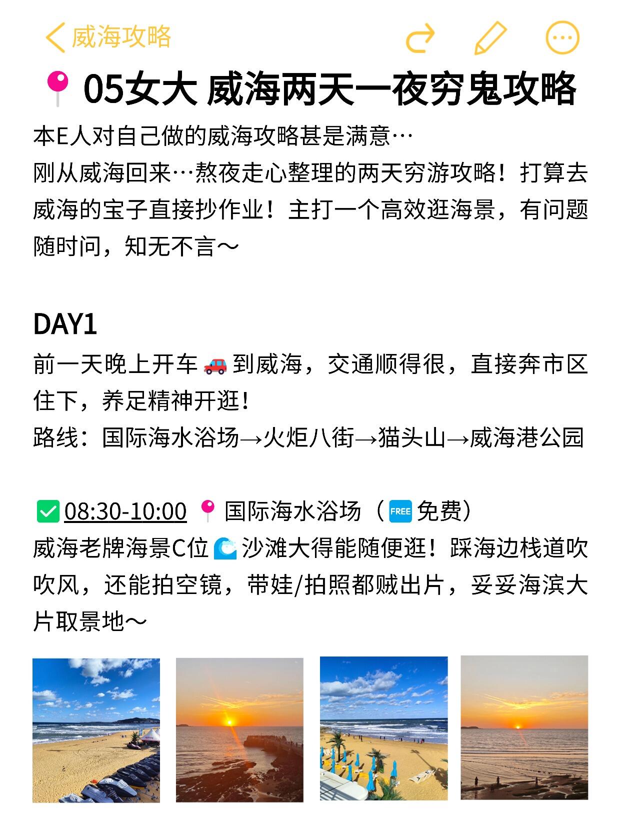 本05女大对自己做的威海穷游攻略那叫一个满意…刚从威海回来,熬了个大夜整理的两天一夜穷鬼攻略!打算去威海的宝子直接抄作业,主打一个花少钱逛遍海景吃遍小吃,有问题随时问,知无不言~