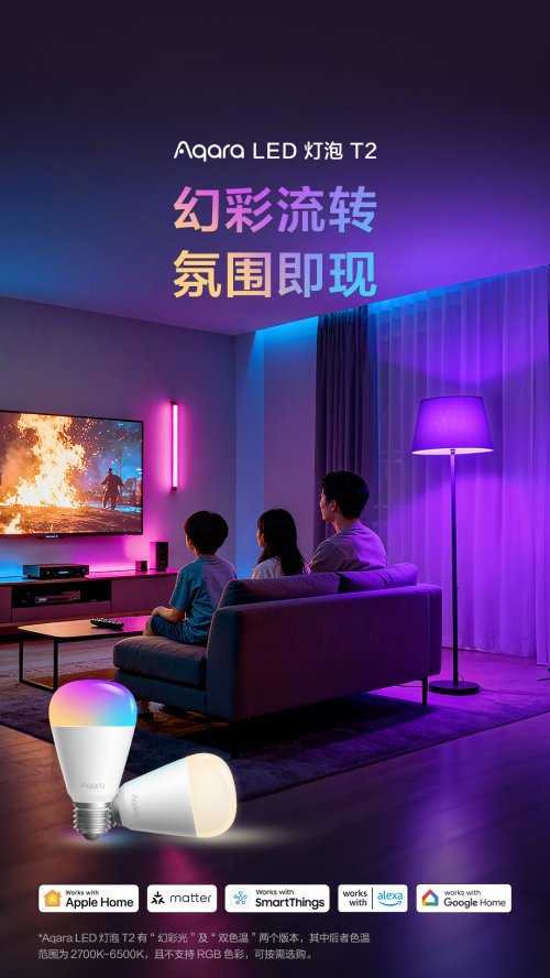 与此同时,Aqara LED 灯泡 T2 还支持 Thread 协议,可直连 Matter 生态,实现跨平台互联互通,让智能照明更开放、更自由。