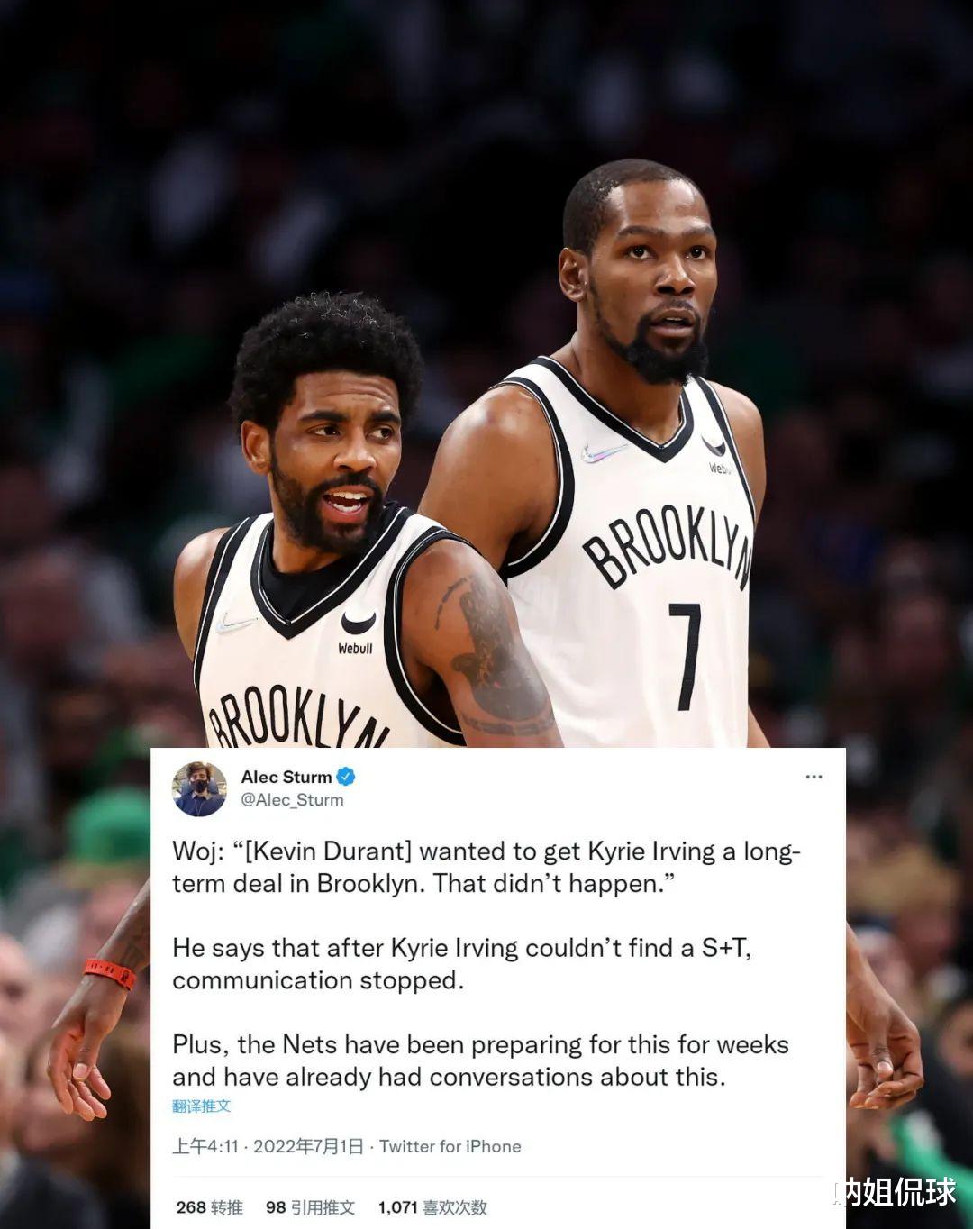 ESPN记者透露,在欧文执行下赛季球员选项之前,杜兰特已经有一段时间没跟篮网交流了,KD希望欧文能在篮网得到一份长约,但这并没有发生。当欧文没有找到先签后换的下家、执行球员选项之后,杜兰特和欧文就不再跟篮网沟通。