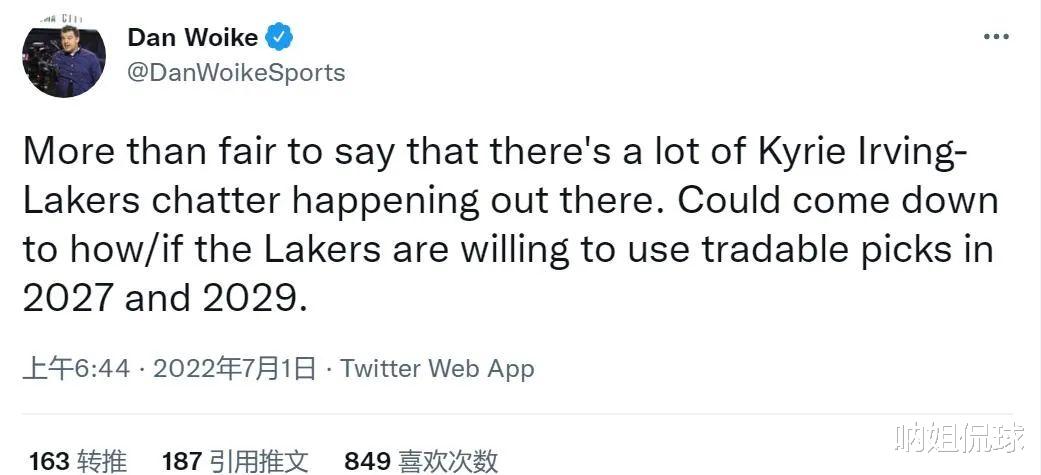 欧文是1年3650万的到期合同,今天NBA记者Dave McMenamin爆料,湖人想通过交易解决创造得分机会的问题,欧文仍然是第一目标。洛杉矶时报记者Dan Woike发推:湖人是否愿意出2027年和2029年选秀权,决定他们能否得到欧文。