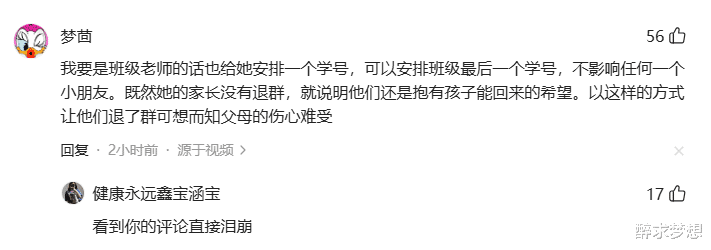 我要是班级老师的话也给她安排一个学号,可以安排班级最后一个学号,不影响任何一个小朋友。既然她的家长没有退群,就说明他们还是抱有孩子能回来的希望。以这样的方式让他们退了群可想而知父母的伤心难受