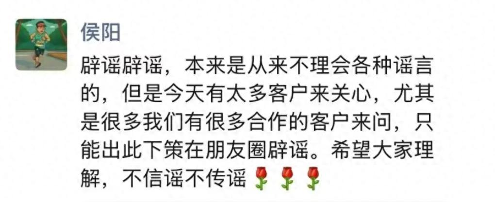 侯阳表示,“本来是从来不理会各种谣言的,但是今天有太多客户来关心,尤其是很多我们有很多合作的客户来问,只能出此下策在朋友圈辟谣。”同时,他呼吁大家不信谣不传谣。