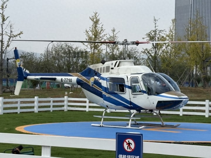 这是一架B-7710直升机,前后两排,除了驾驶直升机的机长,还可以搭乘4名乘客。坐进机舱、系好安全带,戴上耳机,随着螺旋桨飞速旋转,直升机缓缓升空,我们开启了赏青山湖从未体验过的“上帝视角”。