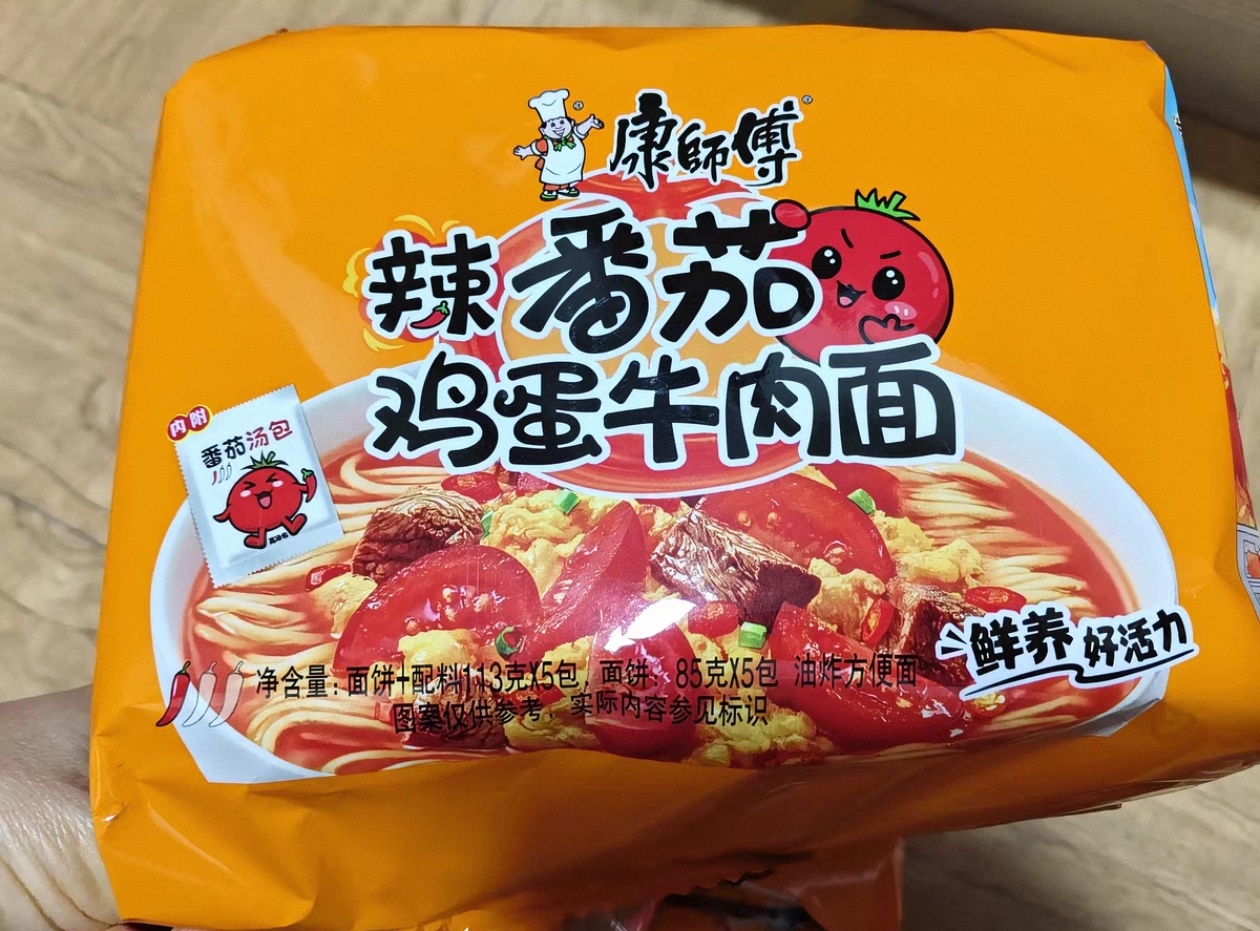 康师傅辣番茄鸡蛋牛肉面是品牌创新口味的代表之一。包装延续红色系,但更偏向番茄的鲜红色调。这款面的特色在于融合了番茄的酸甜、鸡蛋的醇香和牛肉的浓郁,配料中包括真实的鸡蛋碎与牛肉粒。