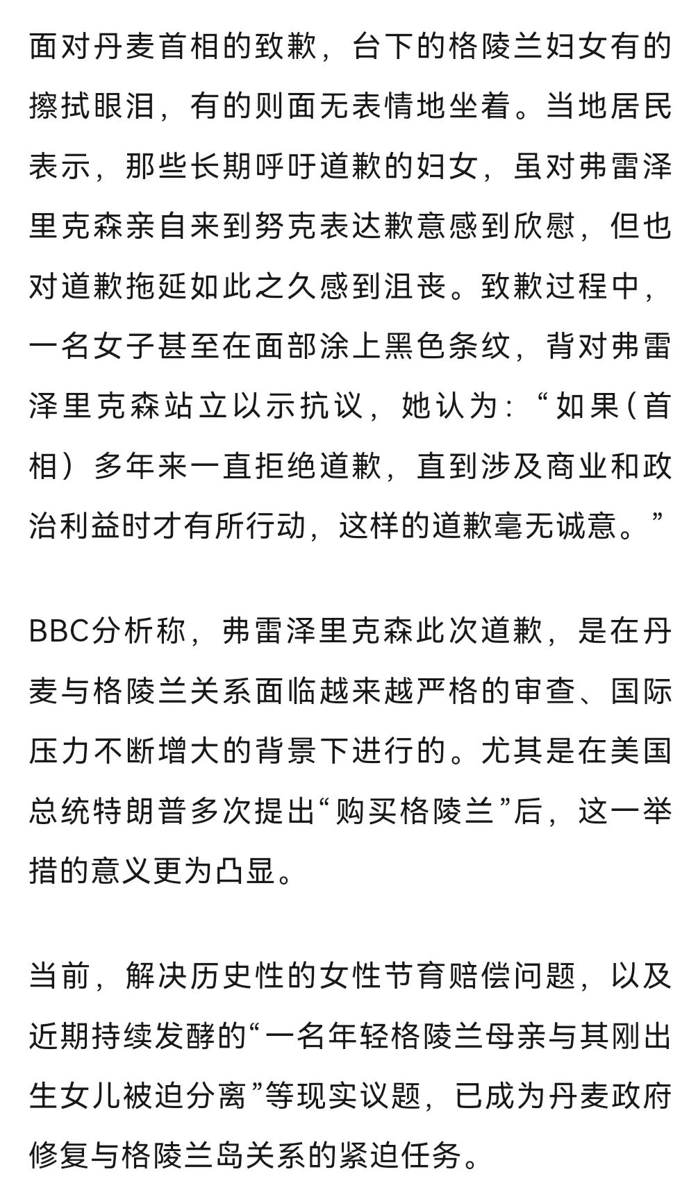 丹麦首相弗雷泽里克森于周三在格陵兰岛首府努克,向曾被强制避孕的格陵兰土著女性致歉。在致歉现场,弗雷泽里克森表示:“亲爱的