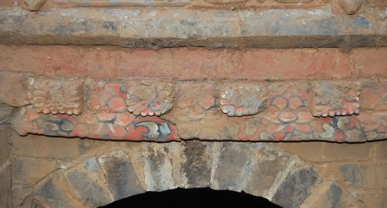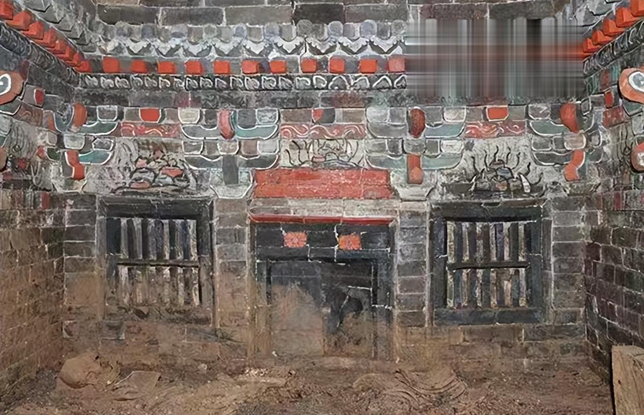 结构之美,在于“仿木如生”的极致匠心。墓室最令人称奇的是其高超的仿木结构建筑工艺。从门楼到室内,工匠以砖代木,逼真地模仿了地上建筑的每一个细节。门楼宛如微缩宫殿,斗拱、椽子、滴水瓦当一应俱全。前室与后室在约1.4米高的壁面上,完全呈现为一座庭院:朱红的大门、黑色的直棂窗、彩绘的梁枋,甚至做出了“一扇关闭,一扇半掩”的动态感。这种将居所完美复刻于地下的做法,是宋代以来墓葬美学“事死如事生”观念的巅峰体现,展现了明人对空间营造和建筑美的极致追求。