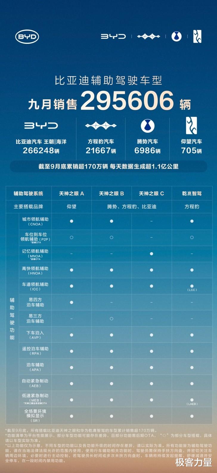 要说智能化转型算是目前比亚迪的新增长引擎。今年初推出的 “天神之眼”辅助驾驶系统,短短几个月就收获了市场的高度认可。截至9月底,搭载该系统的车型累计销量已突破170万辆,仅9月就新增近30万辆,辅助驾驶车型在国内销量中的占比更是高达91.3%。庞大的车主群体带来了海量数据积累,如今比亚迪每天生成的辅助驾驶数据里程超1.1亿公里,为算法优化提供了坚实支撑。而在9月智能驾驶辅助车型销量榜上,比亚迪以26.6万辆的成绩断层领先,销量比第二名零跑的4倍还多,可谓展现出在当下智能驾驶领域的绝对优势。