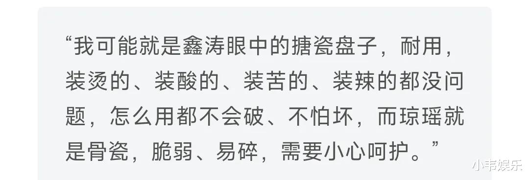 平鑫涛前妻曾经这样评价过琼瑶“我可能是平鑫涛眼里的搪瓷盘子,耐用,装烫的,装苦的,装辣的都没有问题,怎么用都不会不会坏,而琼瑶就是骨瓷,脆弱,易碎,需要小心呵护”!短短几句话道出了心中的无奈,更是控诉多年来的委屈。也把琼瑶的性格展现的淋漓尽致。