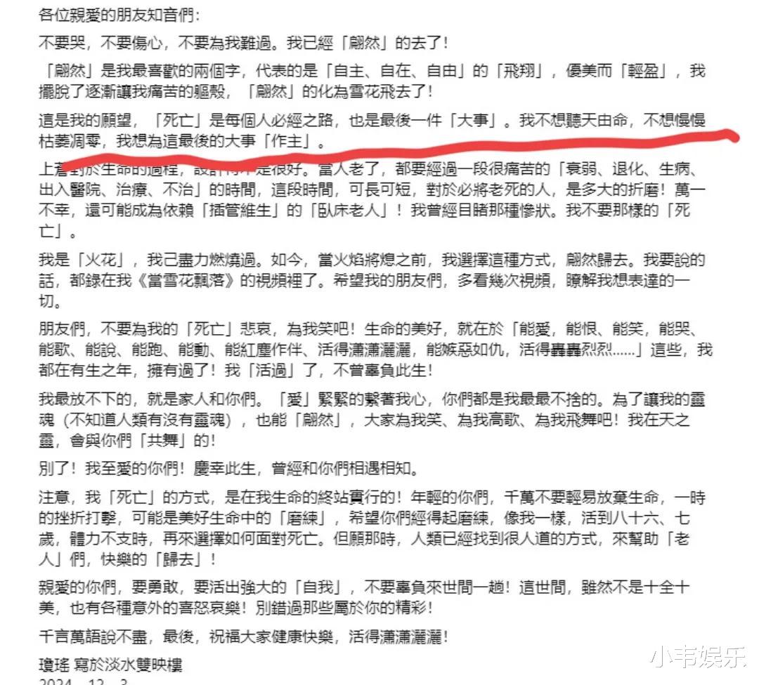 12月4日下午1点22分左右,著名作家琼瑶在自己家中选择轻生,后经抢救无效去世,享年86岁,随后其63岁儿子发现她的遗书,她写到:“我不想听天由命,不想慢慢枯萎凋零,我想为最后这件大事做主”!