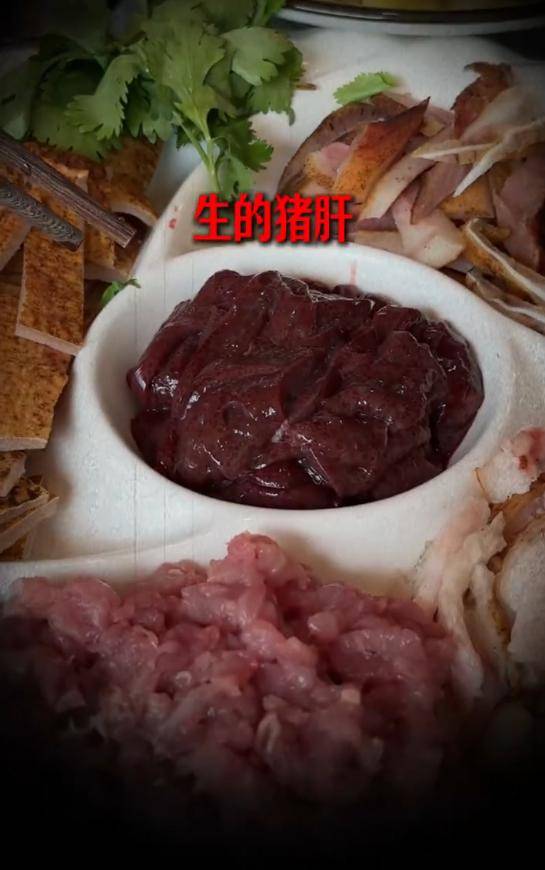 菜式可谓是相当丰富,其中有猪肝、生猪皮、猪头肉皮、猪耳、生猪肉和生猪肥肉。陈国坤面对眼前一盘盘血淋淋、未煮熟的生猪肉,表情相当的复杂。