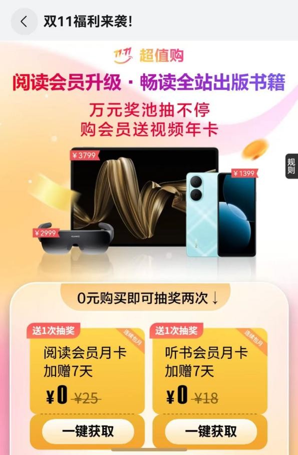 如果遇到想看的影视原著,我就会打开华为阅读。之前就发现它的精品音色听起来一点都不“AI” ,新出的“书馆先生”音色,有非常自然的情感起伏、呼吸和停顿,就像真人在你耳边讲故事一样。现在双11阅读年卡也有特惠,会员内容权益还有升级,免费书库新增大量出版书,入会就能轻松畅读海量好书。