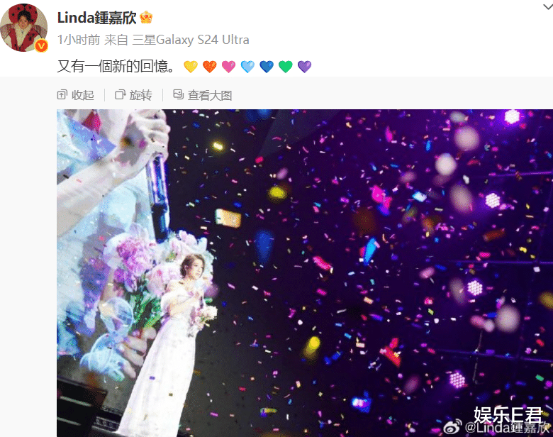 她分享了一段视频,杨思琦与杨茜尧藏在舞台下方,等钟嘉欣谢幕完降下时,两人便将准备好的花束送上,钟嘉欣见到此惊喜当场感动落泪,三人相拥而泣,杨思琦与杨茜尧大赞钟嘉欣唱得好外,还不忘为好姐妹下一站惠州站演唱会卖广告,场面搞笑又温馨。