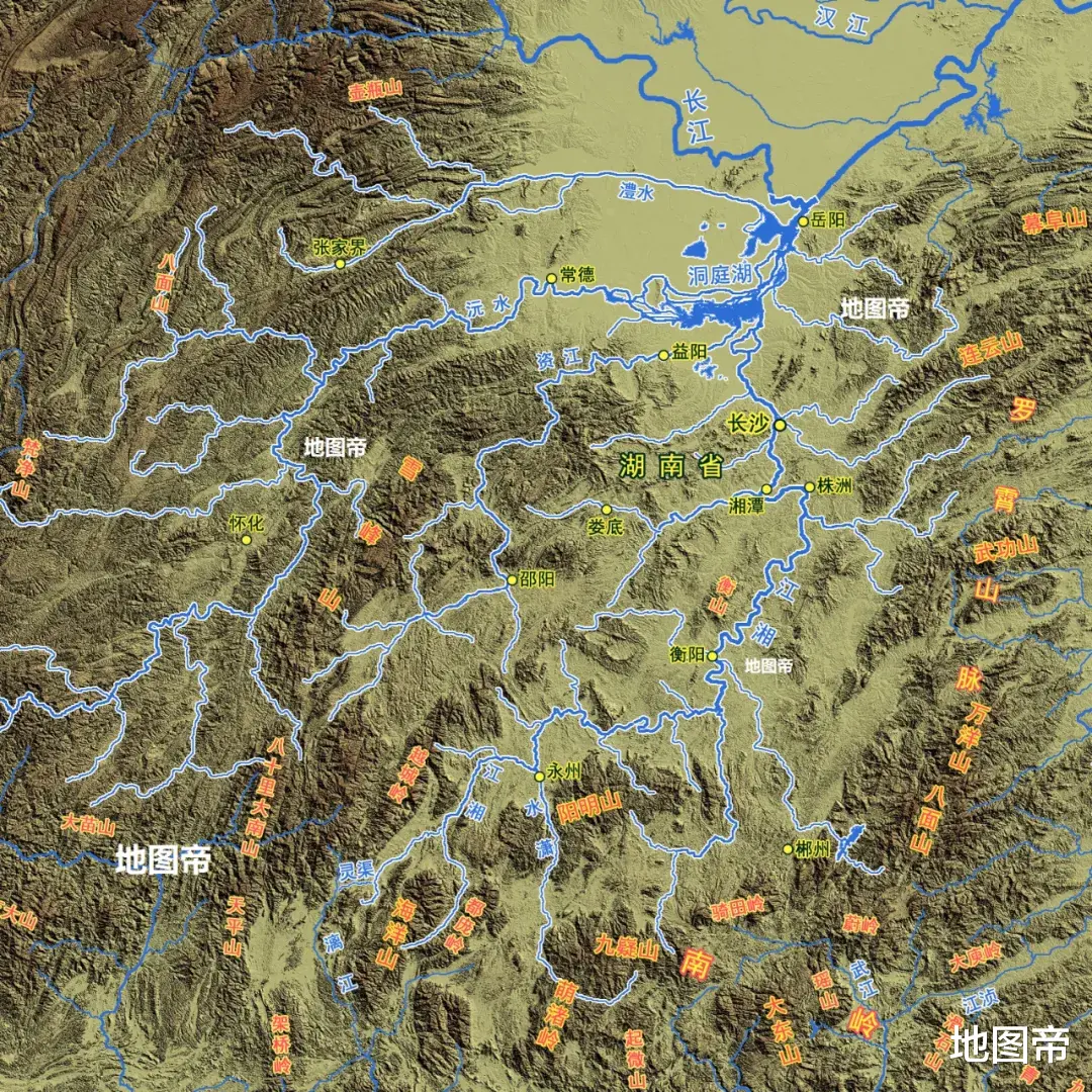 岳阳地势东高西低,东部为罗霄山脉的幕阜山、连云山,最高峰为连云山主峰,海拔1600米,幕阜山主峰海拔也有1595米;西部为洞庭湖平原,江河纵横,湖泊密布。