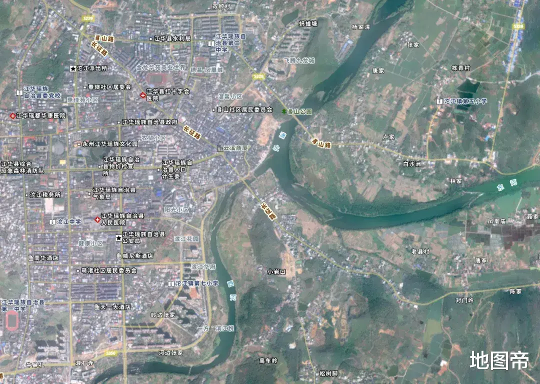 东河在江华县与西河汇流,称为沱江,河水向北流。沱江河段大致只有15千米,以下称为潇水。