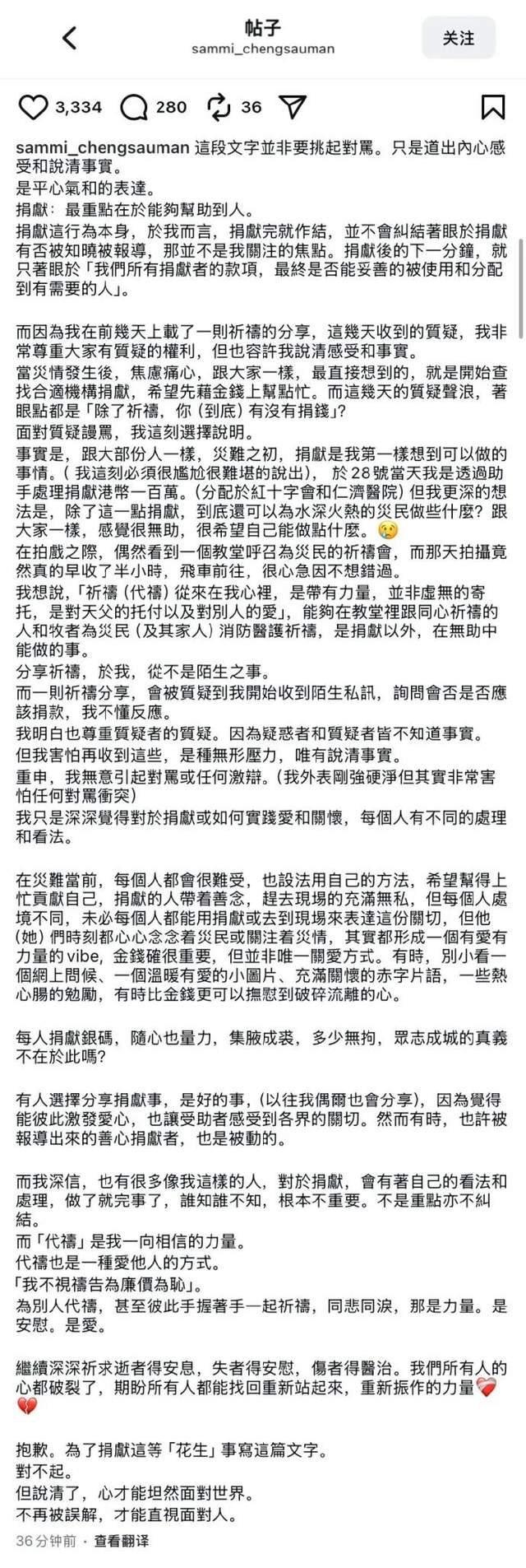 04 两种善意在这篇回应长文中,郑秀文也阐述了她对慈善与关怀的理解。她认为,在灾难面前,每个人都会设法用自己的方法贡献一份力量。