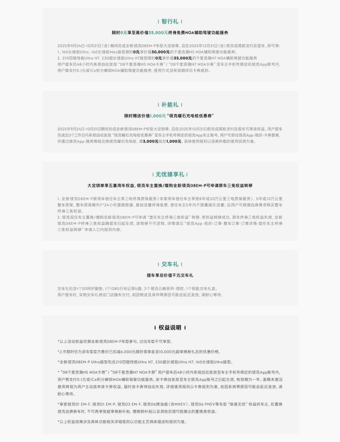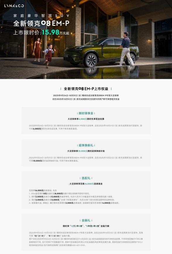 除了强大的产品实力和高效的交付能力外,全新领克08 EM-P还为用户准备了实实在在的购车优惠。限时售价15.98万元起,提供6000元现金优惠、10000元焕新补贴以及12万2年0息的金融方案,综合权益价值至高近7万元,截止时间为10月31日。这样的政策组合不仅降低了购车门槛,更让家庭用户在享受高品质出行生活的同时,实现了“早买早省”的实际利益。