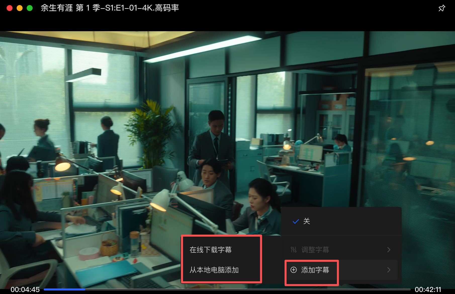 ▲如果遇到没有字幕的也不用担心,绿联NAS自带的播放器可以选择添加字幕功能,在线下载字幕等功能添加字幕。