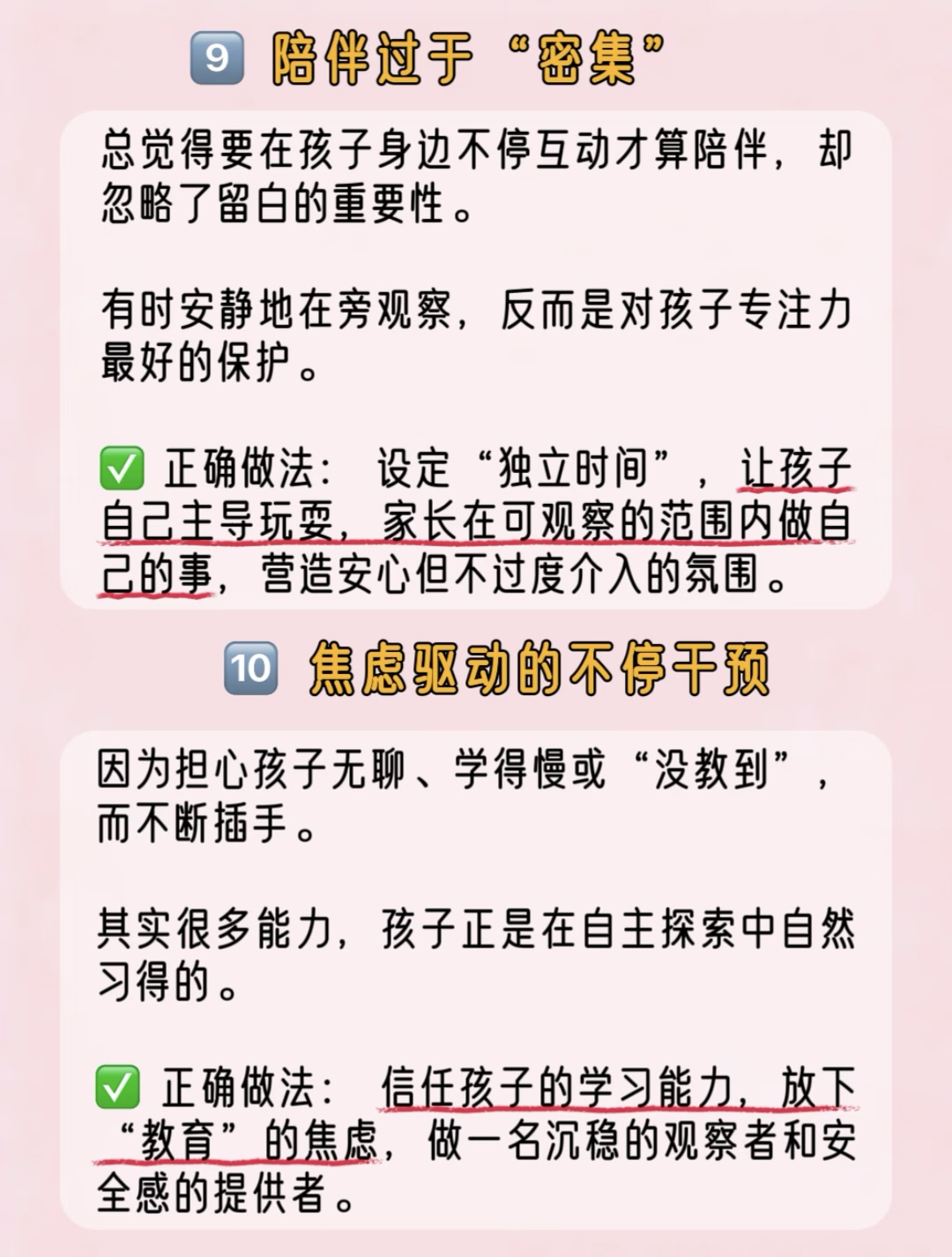 你是不是也经常这样“陪”宝宝?宝宝正盯着墙上的光影发呆,你赶紧塞过去一个玩具;宝宝刚拿起勺子自己舀饭,你怕弄脏衣服立马抢过来喂;宝宝在专心搭积木,你一会儿问“要不要喝水”,一会儿又夸“宝宝真棒”!看似是关心和陪伴,其实这些行为正在悄悄破坏孩子的专注力,甚至影响他们的安全感和独立性。今天咱们就来聊聊,那些容易被忽略的“过度打扰”行为,看看你中了几个?