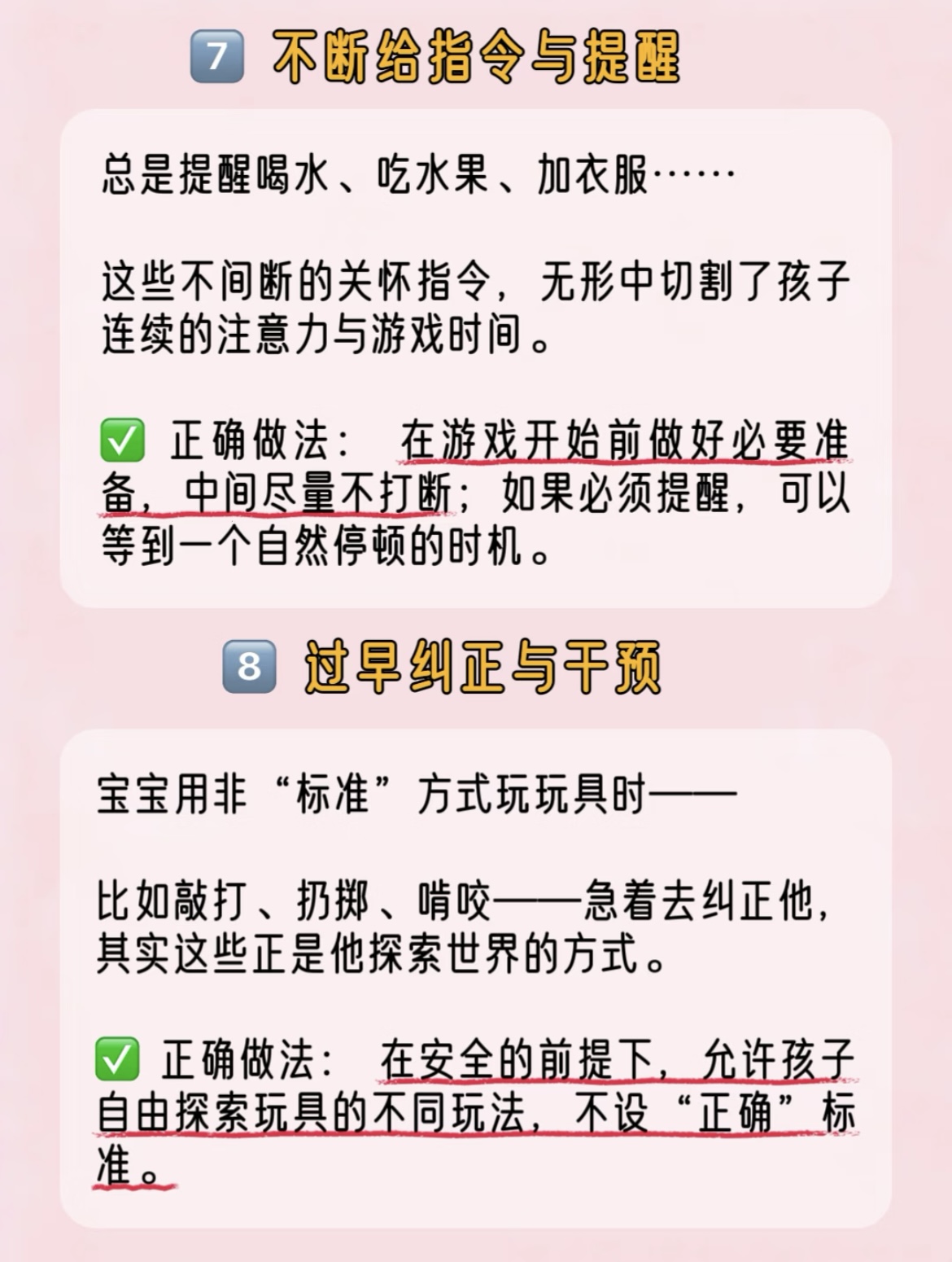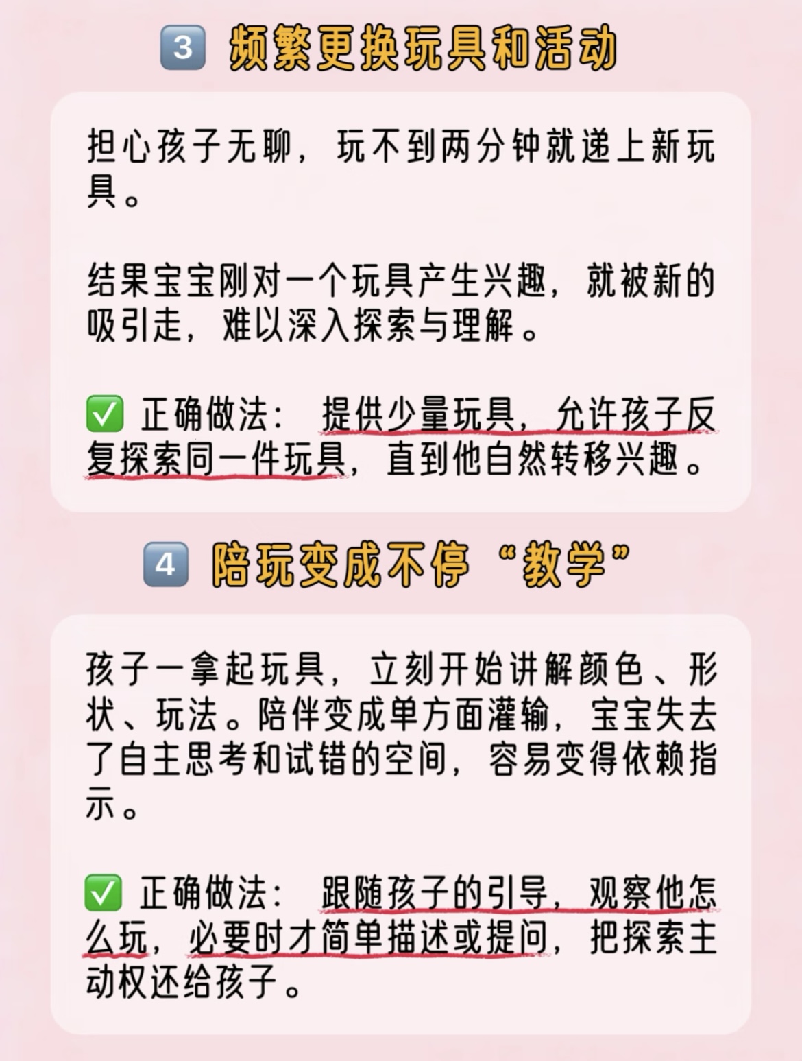 还有些家长总怕宝宝“做不好”,看到孩子系鞋带费劲,立马伸手帮忙;看到孩子拼图拼不对,马上指挥“应该这样放”。这种“热心代劳”看似贴心,实则剥夺了孩子练习解决问题的机会,他们会习惯等待指令,而不是主动尝试。同样,宝宝玩玩具时,刚拿起绘本,就被灌输“这是三角形”,或者一个玩具玩两分钟没换新,家长就着急更换,这种“填鸭式教学”和频繁更换活动,会让宝宝的大脑处于超负荷状态,反而难以沉浸其中。