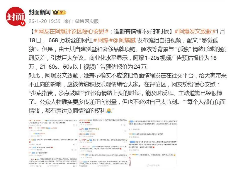 1月20日,生活领域博主阿爆(本名杨李云)通过个人账号发文致歉,为自己此前发布负面情绪视频占用公共资源道歉,坦言“能有今天全靠粉丝托举,会摆正好自己的位置”。然而这场迟来的歉意,并未平息争议——从1月18日流泪诉孤独引发群嘲,到修改文案、账号反复切换私密状态,再到深夜避重就轻道歉,短短48小时的连环操作,让相关话题持续霸榜,也折射出大众对网红“特权式诉苦”的集体反感。