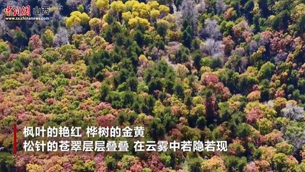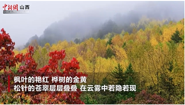 近日,山西吕梁,方山县山西梅洞沟省级湿地公园迎来“色彩绽放期”。枫叶的艳红、桦树的金黄、松针的苍翠层层叠叠,在云雾中若隐若现,仿佛打翻调色盘,共同构成一幅金秋画卷,吸引众多游客驻足打卡。