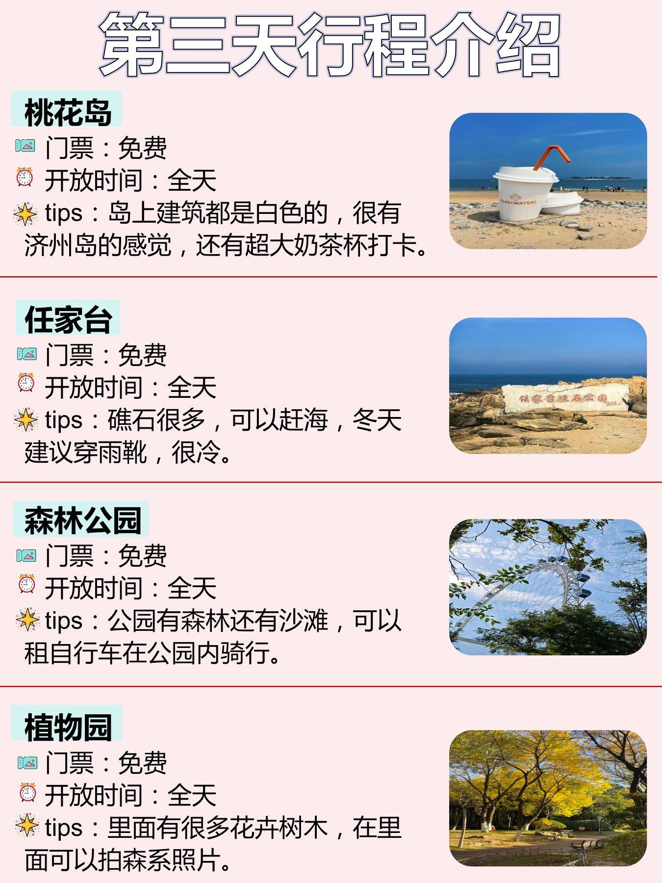 🔸第三天去🌸桃花岛,白色建筑济州岛既视感,还去了任家台礁石🪨多,缝隙里有海星记得穿雨靴,真的有点冷~接着去了🌳森林公园还有植物园,植物园花卉树木超多,拍森系照片分分钟出片!晚上🥘吃了南小庄岚山咕嘟鱼鱼肉很嫩,很入味,汤汁拌米饭我吃了3碗🥣。