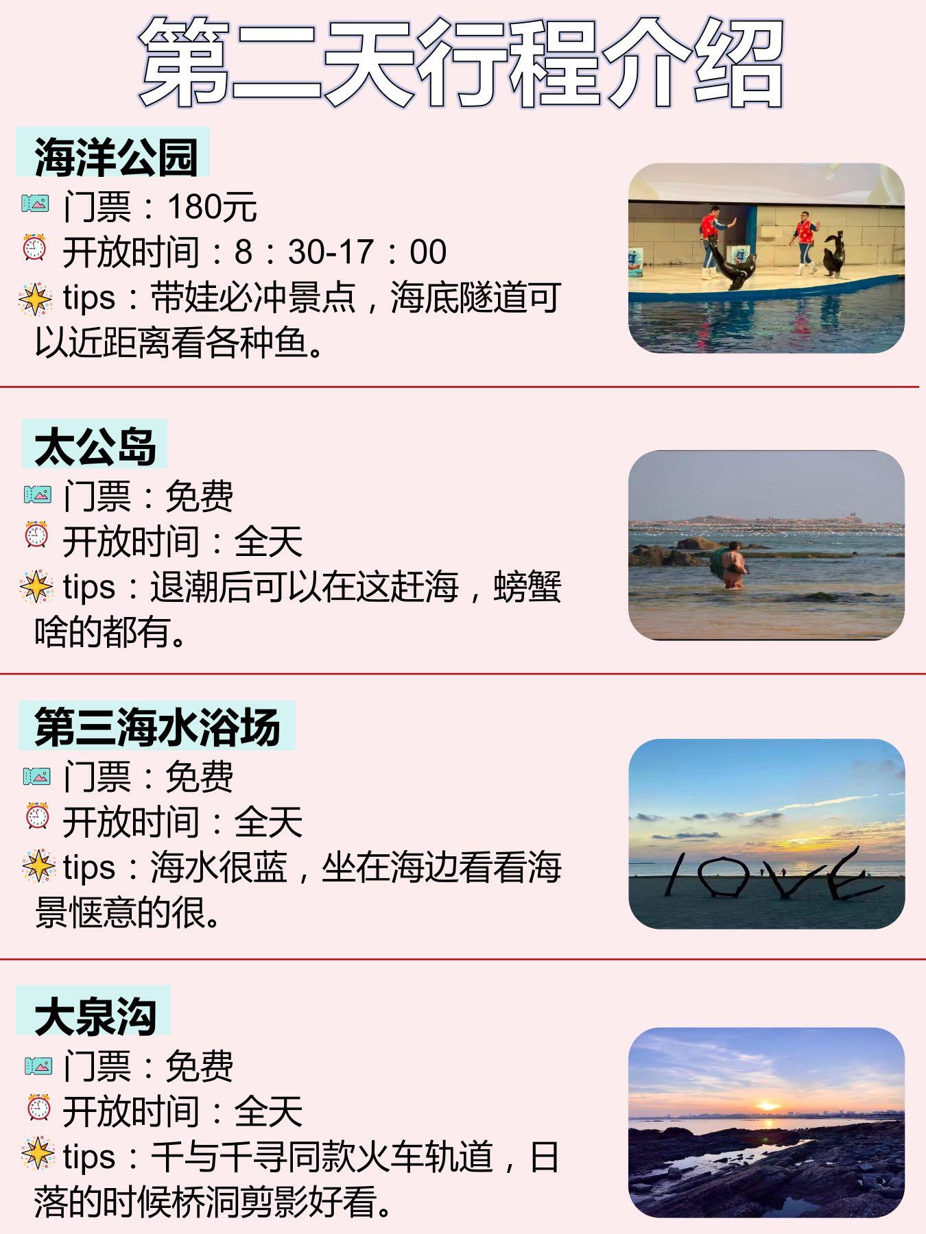 🔸第二天早上起床吃当地特色🥟宽婆子海鲜锅贴,外皮脆脆的里面满满馅再来碗汤,吃的暖和和的就出发去🪼海洋公园,海底隧道能近距离看各种鱼🐠,拍照也很好看,还去了太公岛赶海就是有点冷🥶但是体验感很好!接着去了第三海水浴场坐海边发呆惬意到不想走,傍晚去了大泉沟🌄,这的火车轨道千与千寻同款,桥洞剪影绝了,拍照氛围直接封神!
